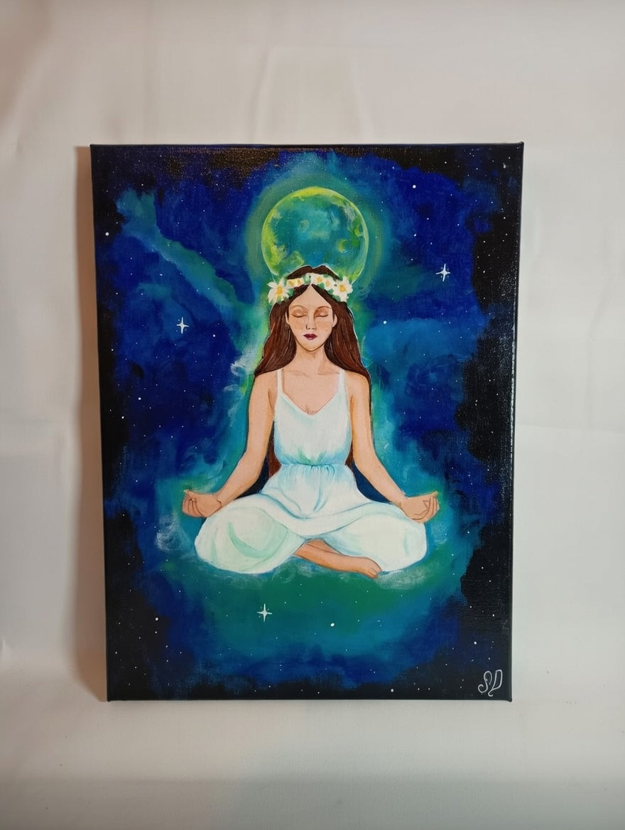 Laissez-vous transporter par cette escale au cœur de l'univers. "La Méditante Céleste" incarne l'union parfaite entre la paix intérieure et l'énergie infinie du cosmos. Sous la lueur bienveillante de la lune, cette figure sereine nous rappelle que nous portons tous une part d'étoiles en nous.