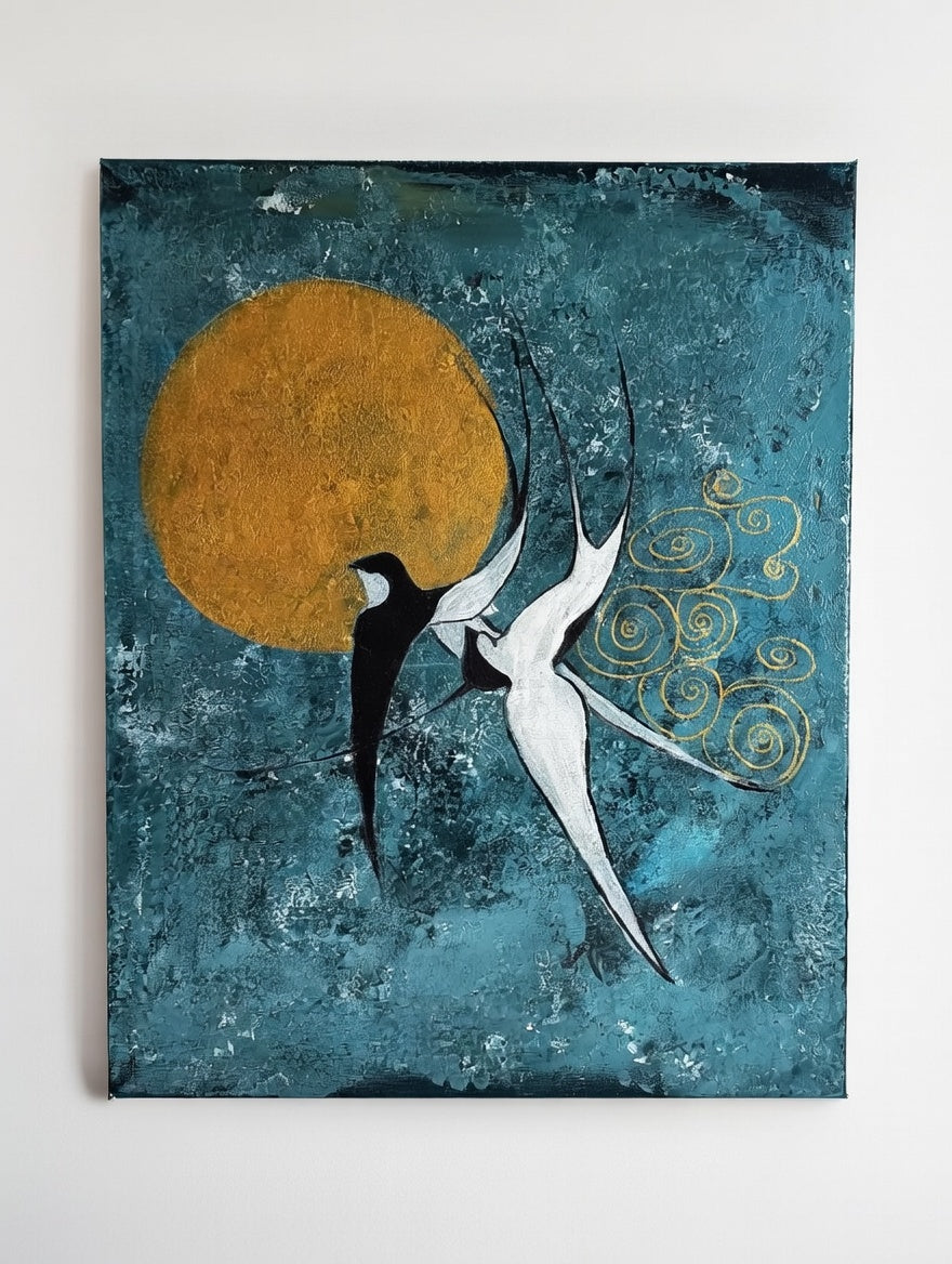 Laissez-vous transporter par cette toile où le ciel et la terre se rencontrent dans un ballet de liberté. Deux hirondelles, symboles de renouveau et de fidélité, s'élancent devant un astre d'or rayonnant.