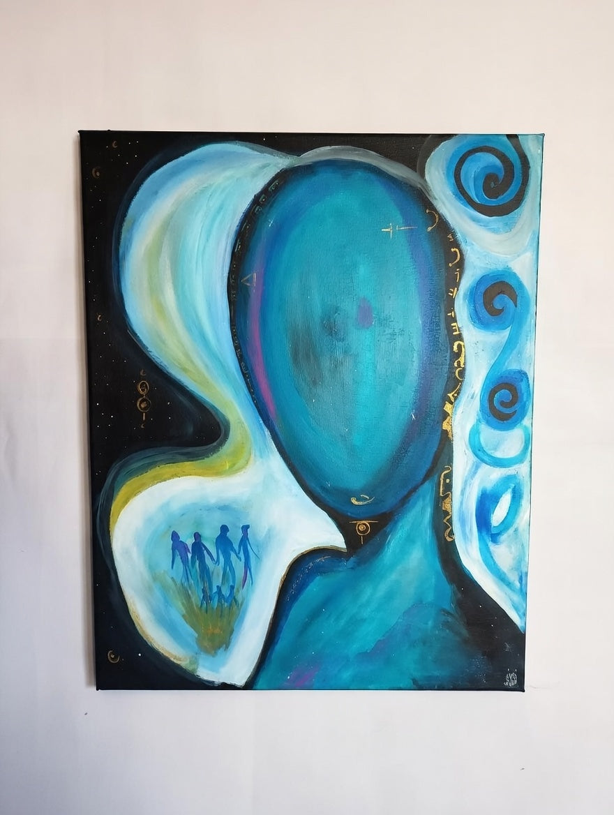 Cette peinture acrylique sur toile est une invitation au voyage intérieur et à la connexion universelle. Au centre, une silhouette éthérée aux nuances de bleu profond semble émerger de la nuit étoilée, évoquant une présence à la fois ancestrale et protectrice.
